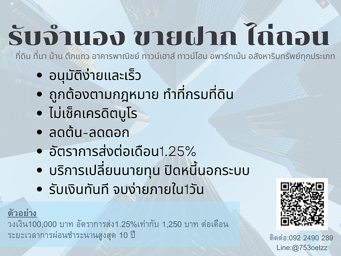 บริการรับจำนองหรือขายฝากบ้านและที่ดินเปล่าดอกเบี้ยต่ำ 1.25%ต่อเดือนหรือ15%ต่อปี ระยะเวลาต่ำสุด 1ปี สูงสุด 10ปี